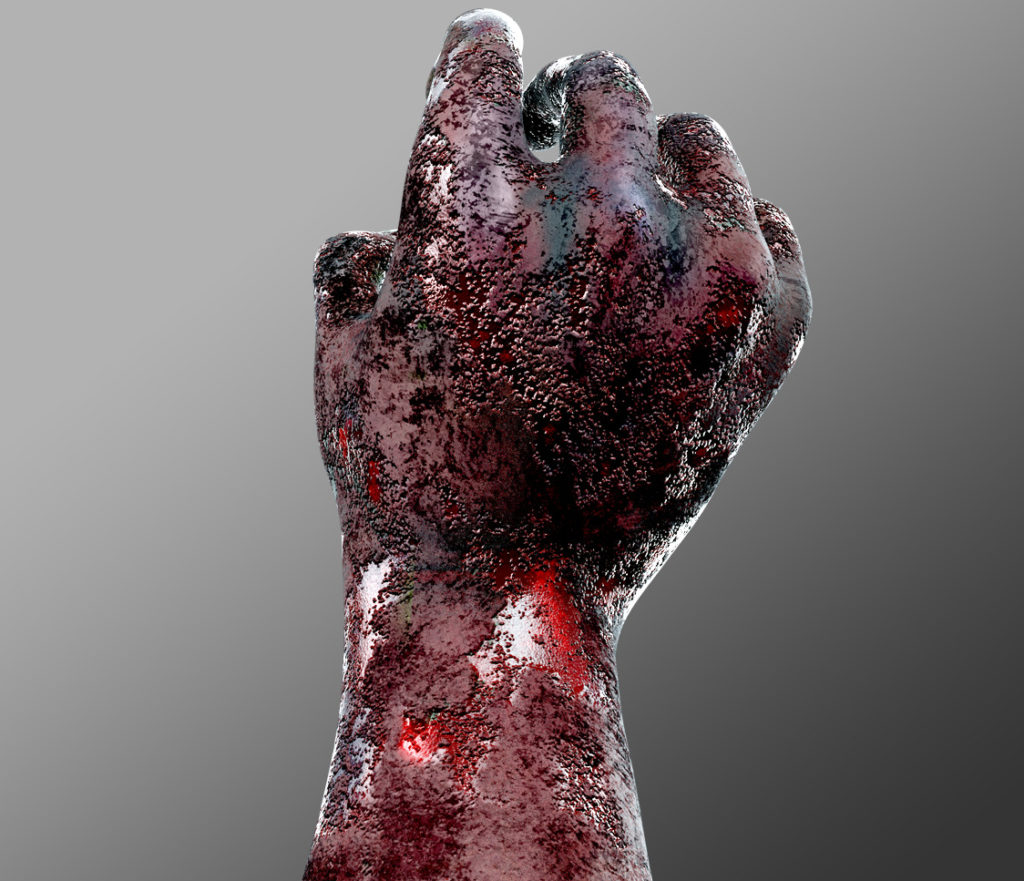 Zombie hand with many layers to create the look of rotten, bloody, dirty skin.