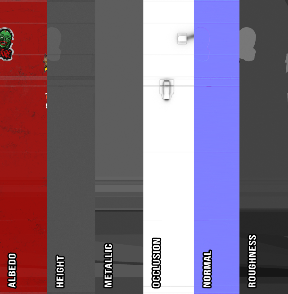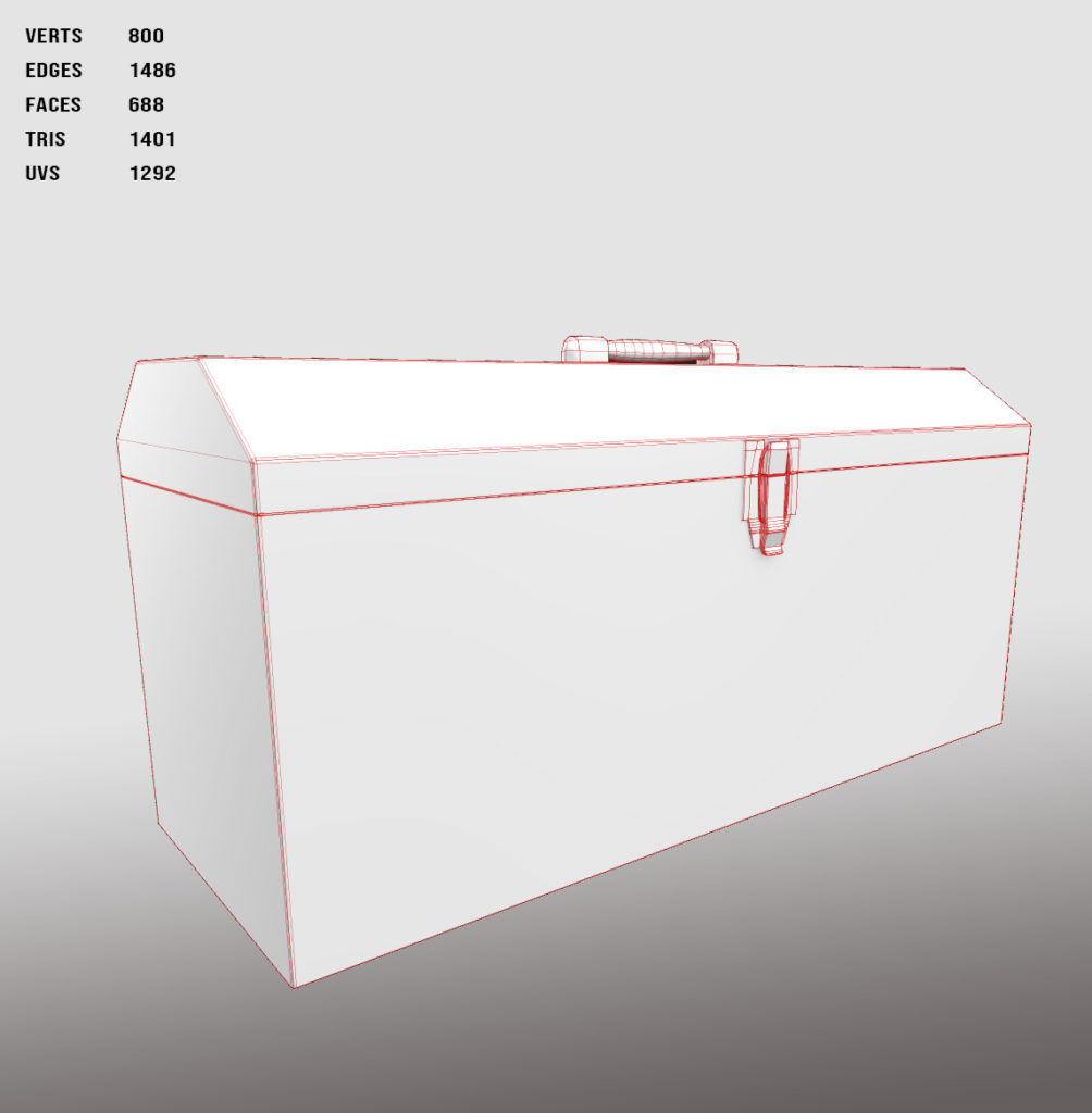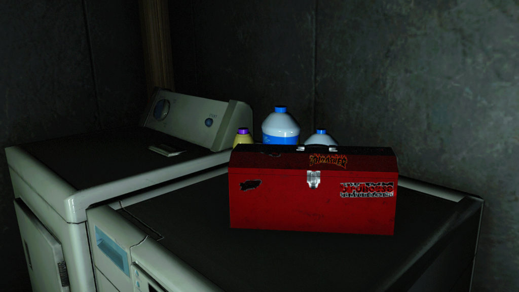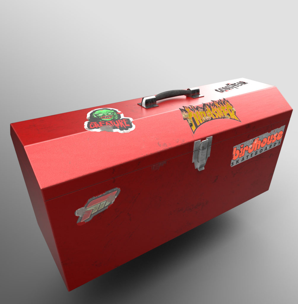 Standard red tool box, a little used and worn. This was designed for my Capstone team project, a horror genre game.